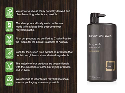 Go easy on your skin (even the sensitive kind) with Every Man Jack Sandalwood Mens Body Wash. Made with coconut-derived compounds to deeply cleanse with gentle foam and glycerin for super hydration, you’ll be able to nourish and offer protection to your skin without drying it out. Our mens moisturizing body wash is made for people just like you: outside lovers, adventure seekers, sustainability stewards. By the use of as many plant-based and naturally derived ingredients as conceivable in our gluten-free formula, we’re ready to create a soap body wash that’s better for you (and your sensitive skin) and better for the environment. What’s more, our packaging is made from 50% post-consumer recycled content. Sandalwood, one of our best smellers, will leave your skin smelling like amber, vetiver, and vanilla. The outside-inspired scent is reminiscent of the woods and forests you’re no stranger to hiking through. You’re going to need this body wash twin pack because it’ll be the very first thing you reach for in your post-outside-adventure shower