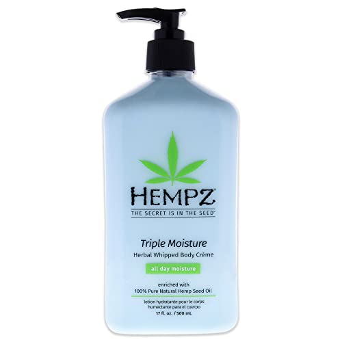 Hempz Triple Moisture herbal Whipped Body creme is enriched with 100% pure Natural Hemp Seed Oil and fortified with their exclusive all day Triple Moisture Complex of hydrating Yangu Oil, Vitamin rich, anti-aging Apple Fruit Extract and Potassium rich Cogon Grass Extract. This signature triple Moisture whipped Body creme provides deep 24-hour moisturization that softens even the driest skin.