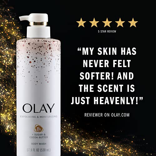 Olay Exfoliating and Moisturizing Body Wash, made with Sugar and Cocoa Butter, infuses your skin with premium skin care ingredients. Use our luxe formula day by day to softly massage away dead skin cells to show radiant, moisturized skin. Supercharged with Vitamin B3 Complex, this nourishing body wash revitalizes and quenches thirsty skin for long-lasting hydration. It is also made with Cocoa Butter, which feels ultra-nourishing on your skin. Never worry about an oily, coated feeling because this body exfoliator rinses off clean. Shower yourself in Olay’s 60 years of beauty science for hydrated, healthy-having a look skin from head to toe.