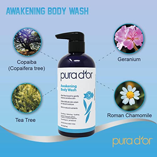 PURA D’OR Awakening Body Wash (16oz) with Aloe Vera, Chamomile, Lavender, Tea Tree and Natural Nutrients – pH Balanced…